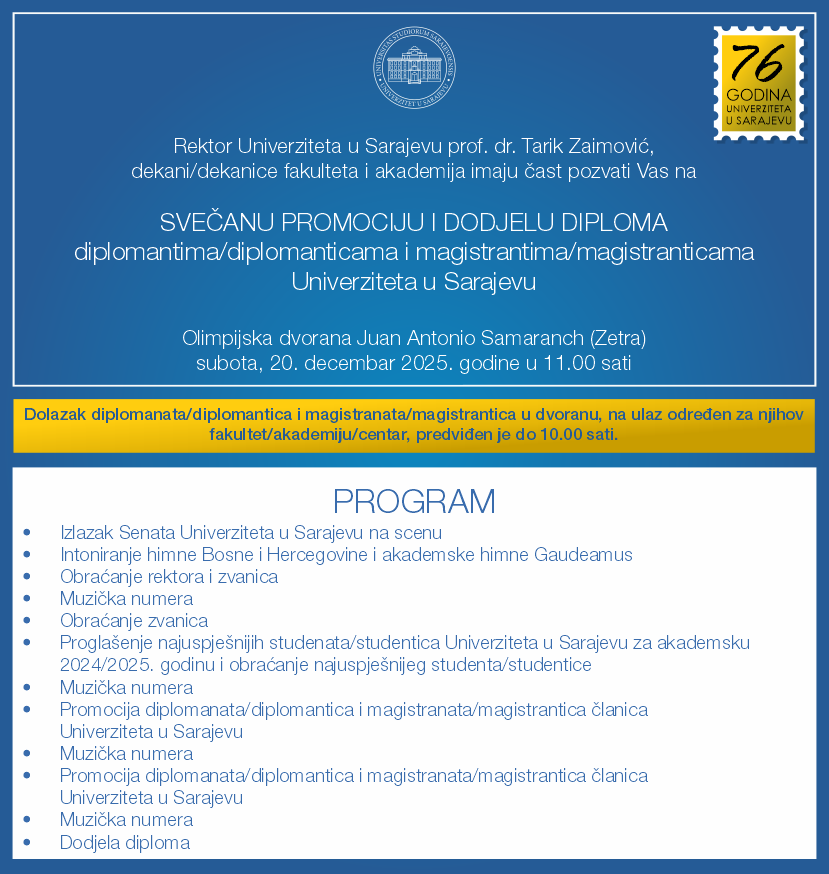 Svečana promocija i dodjela diploma diplomantima i magistrantima Univerziteta u Sarajevu održat će se u subotu, 20. decembra 2025. godine u dvorani „Juan Antonio Samaranch“ (Olimpijska dvorana Zetra) sa početkom u 11:00 sati.